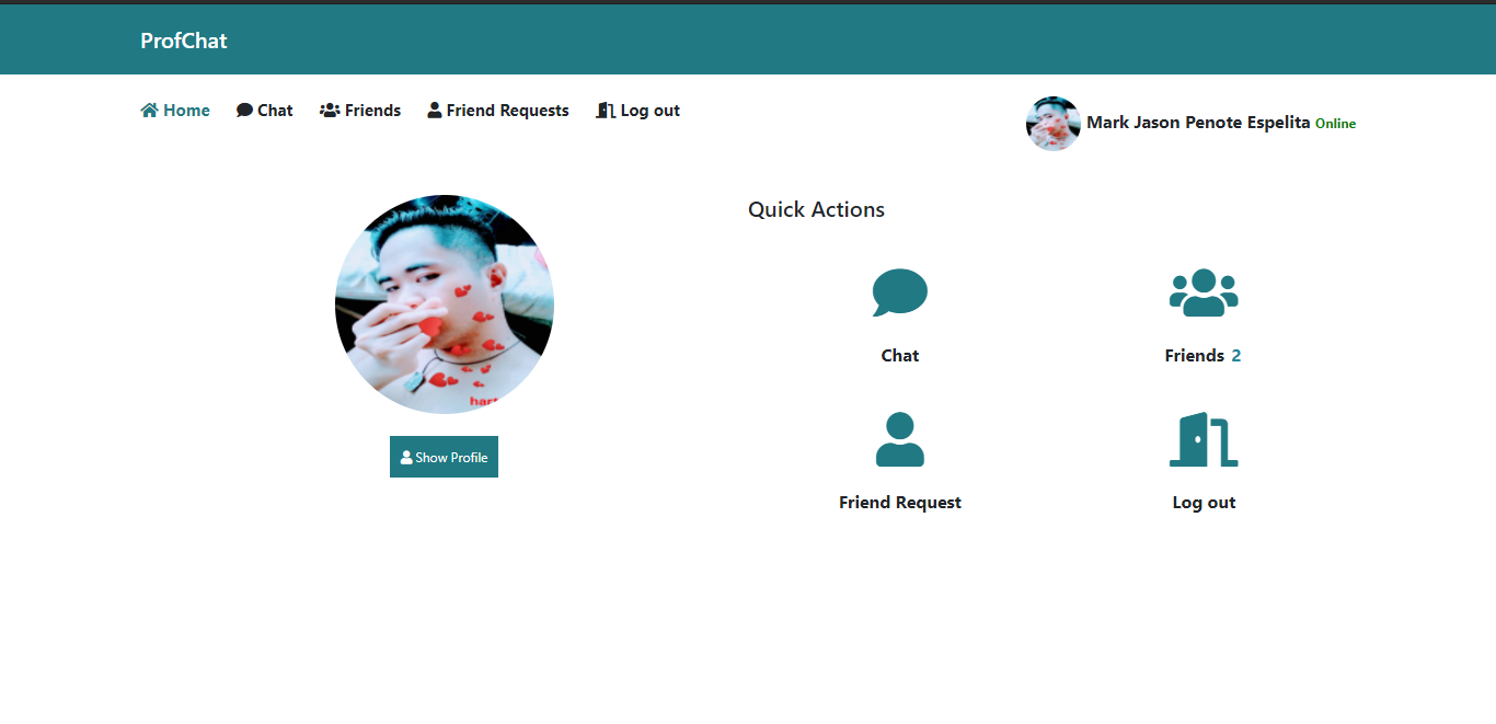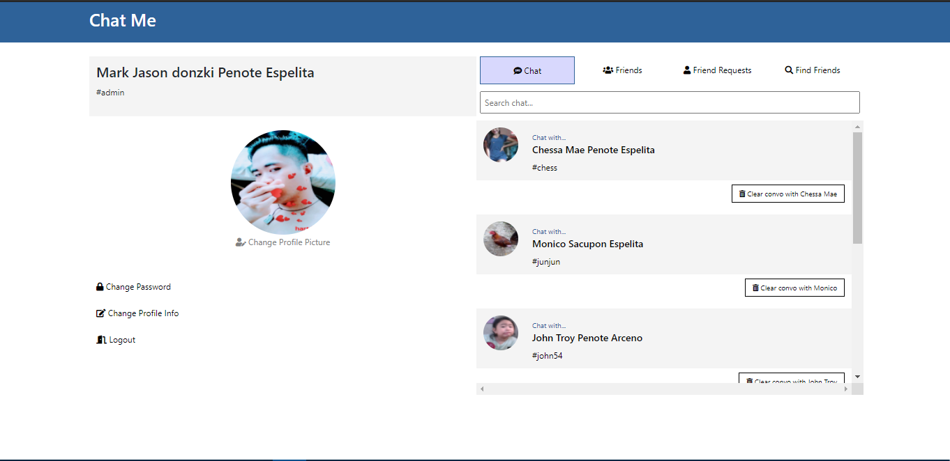 Personal best chat system using PHP and MySQL database. Can send files(audio, video, pdf's and other documents) and can play audios and videos through chat. (Home page)
